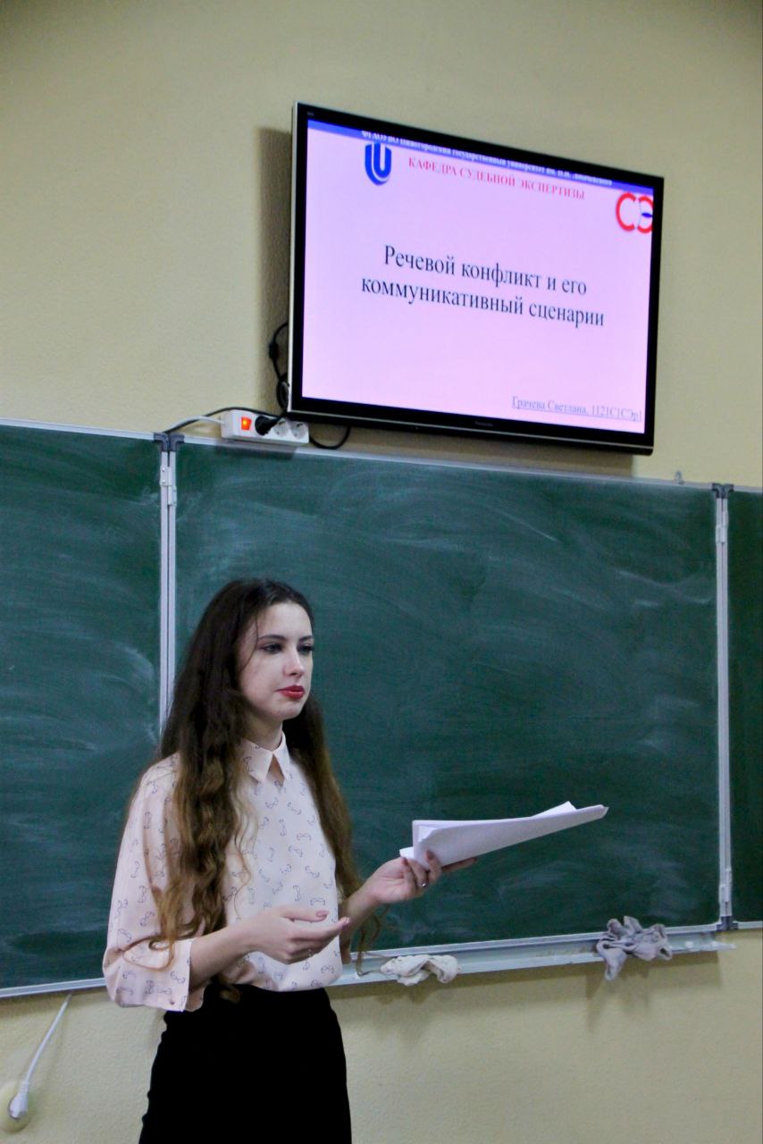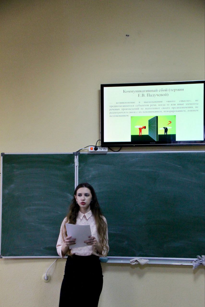 С основным докладом-презентацией «Речевой конфликт и его коммуникативные сценарии» выступила студентка 5 курса Грачева Светлана.