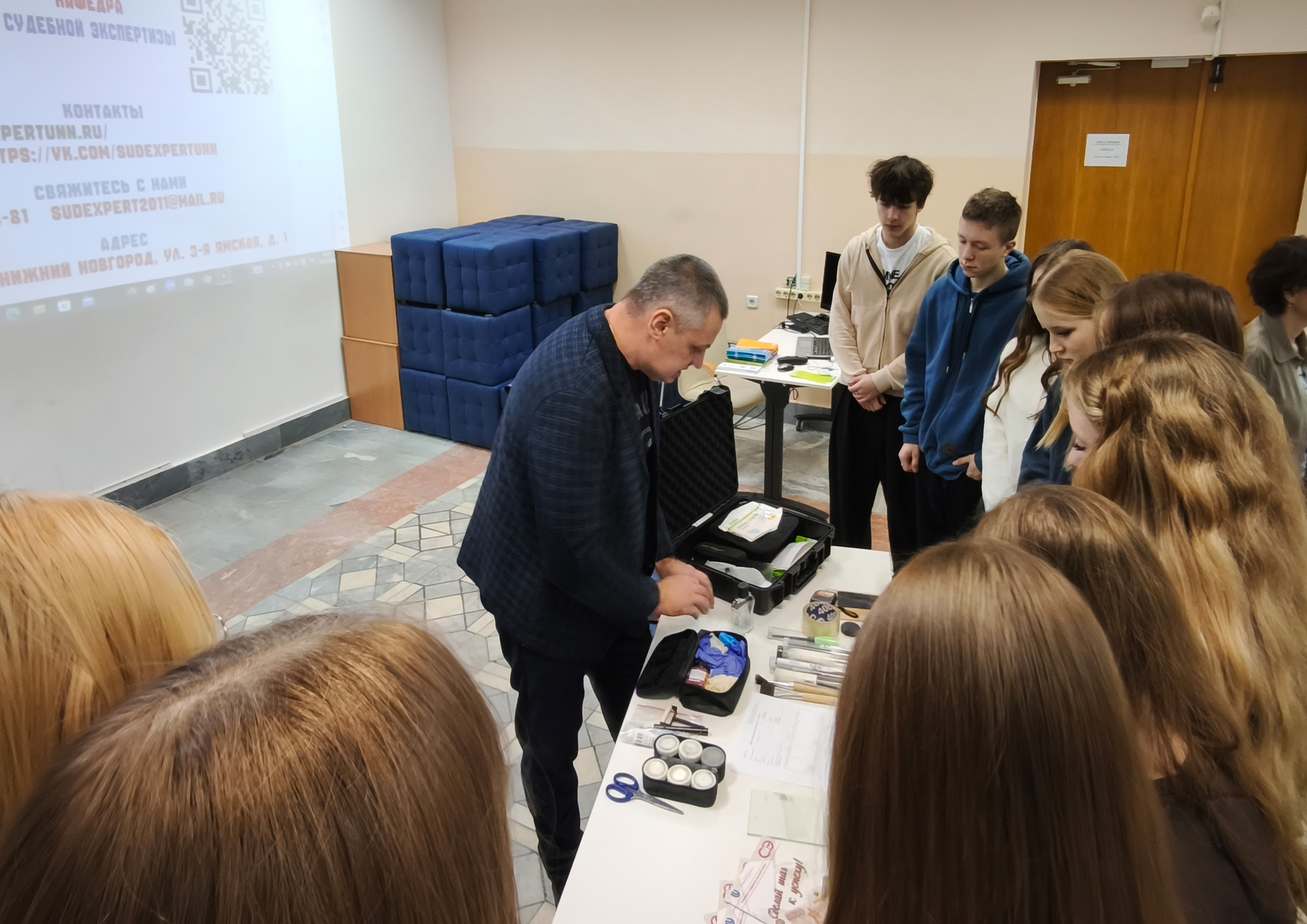 19 января на базе ННГУ им. Н.И. Лобачевского состоялась встреча с учащимися лицея из г. Советска Кировской области. Отдельным блоком в рамках информационно-просветительского мероприятия стало общение с представителями кафедры судебной экспертизы. Доцент Вячеслав Евгеньевич Лапшин и студентка Надежда Купцова стремились познакомить учащихся с профессией эксперта-криминалиста и расширить их представления о современной системе судебно-экспертной деятельности.